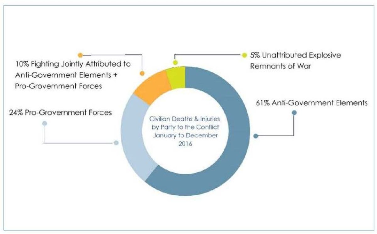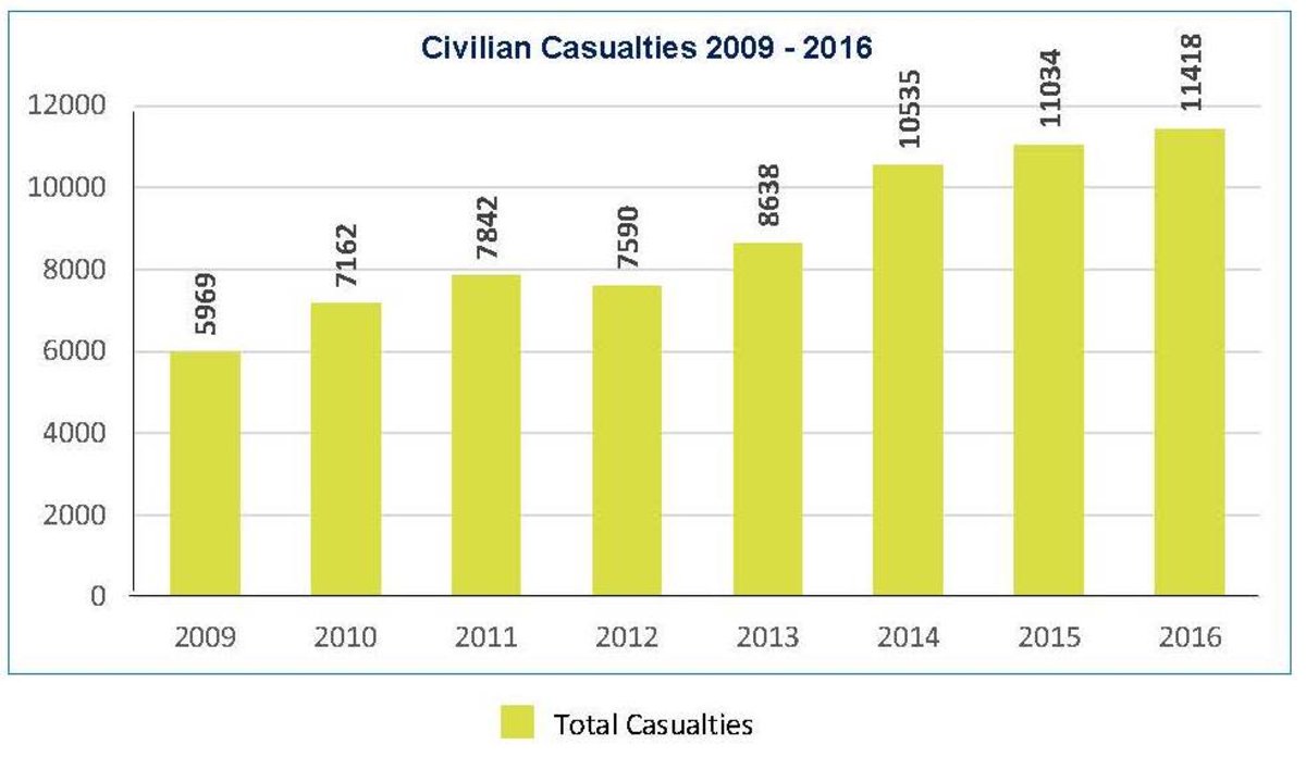 “Conflict-related violence exacted a heavy toll on Afghanistan in 2016, with an overall deterioration in civilian protection and the highest-total civilian casualties recorded since 2009, when UNAMA began systematic documentation of civilian casualties.”