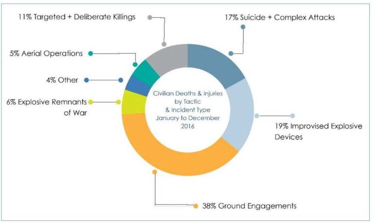 Ground engagements, particularly in areas populated or frequented by civilians, were the leading cause of civilian casualties, followed by improvised explosive devices, suicide and complex attacks and deliberate killings.