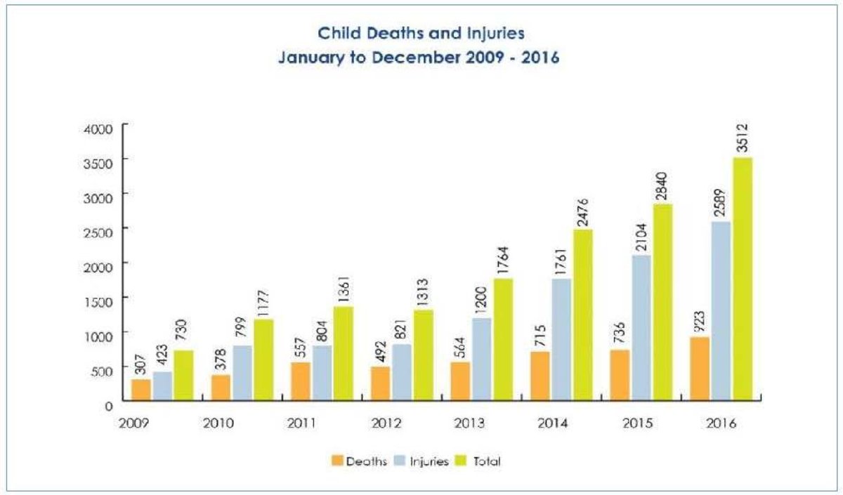 The mission documented 3,512 casualties among children, including 923 deaths and 2,589 wounded. The figures represent 24 percent increase from 2015 and the highest number of child casualties recorded by UNAMA in a single year.
