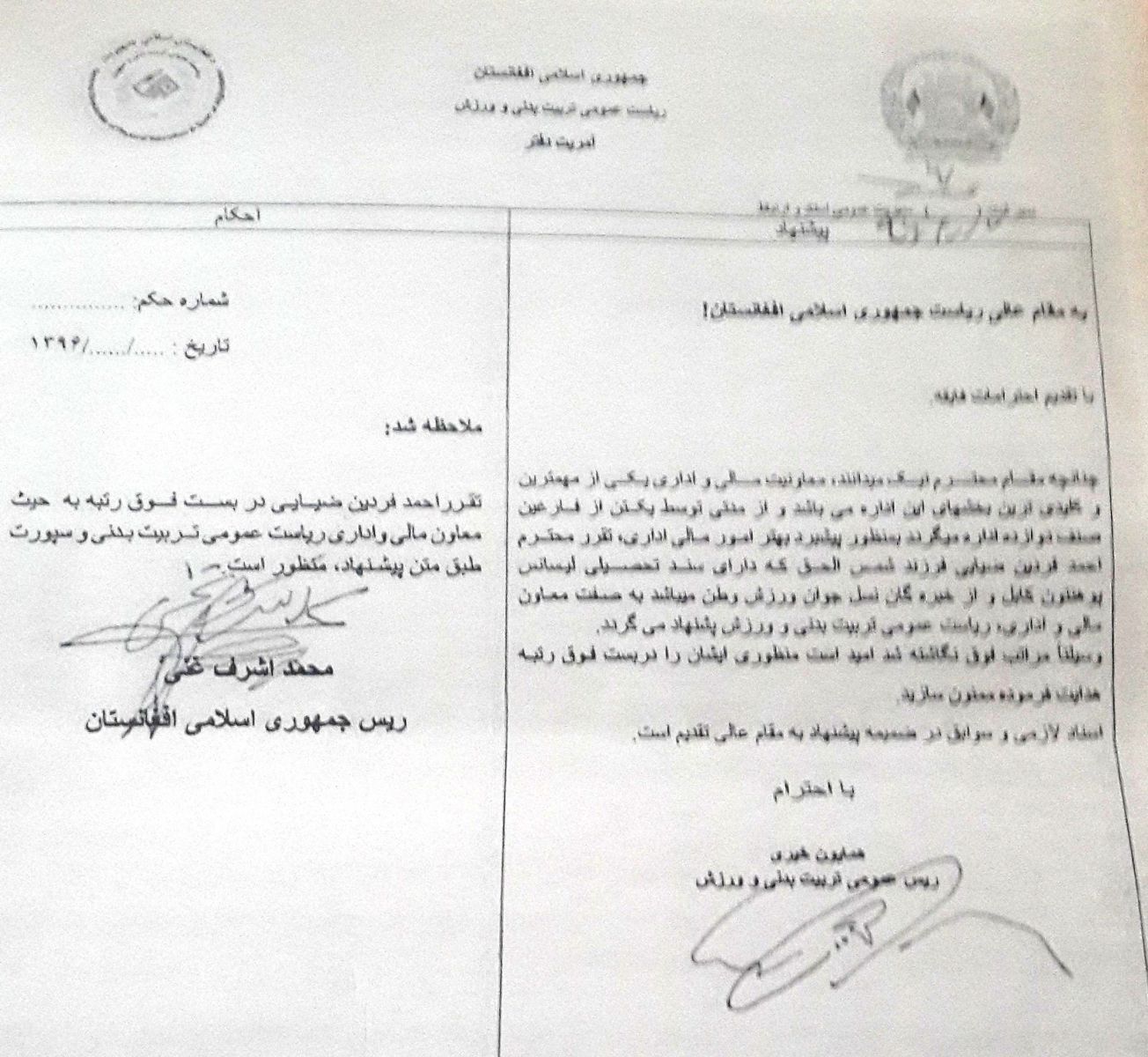 آنان کاپى را در اختيار رسانه ها قرار دادند که به گفتۀ آنها پيشنهاد ریاست عمومی تربیت بدنی و ورزش است و طى آن، احمد فردین ضیایی به حیث معاون مالی و اداری ریاست يادشده پيشنهاد شده است.