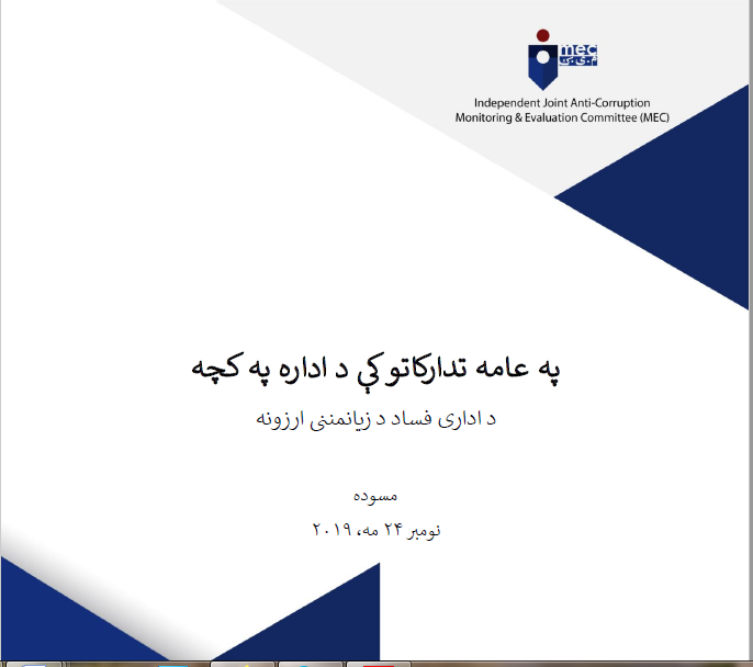 پژواک به گزارش ۱۰۴ صحفه ای کمیته مستقل نظارت و ارزیابی مبارزه با فساد اداری یا “میک” که در جریان ماه های جولای و نومبر سال ۲۰۱۹ از کارکرد اداره تدارکات ملی افغانستان و سکتور تدارکات تهیه شده است، دست یافته است.