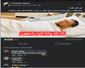 يک تن از کاربران فيسبوک به نام(Cricketer Queen) در گروپ صفحۀ فيسبوک، زيرنام محصلين پوهنتون کابل (Kabul University Students)، اين مطلب را به تاريخ ٢٩ عقرب سال روان زيرعنوان: «خبر تکان دهنده! محمد محقق در نتيجۀ بيمارى ويروس کرونا، امشب در يکى از شفاخانه هاى ترکيه درگذشت»، منتشر ساخته است.
