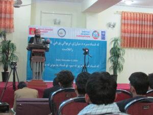 این نشست؛ پیرامون مبارزه با فساد به کمک مالی سفارت دنمارک، از سوی ادارۀ انکشافی سازمان ملل متحد؛ در ولایات ننگرهار، کنر، لوگر و کاپیسا راه اندازی شده بود که مقامات محلی، فعالان مدنی، بزرگان قومى و جوانان در آن حضور داشتند.