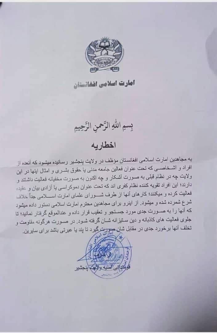 در همین حال، این اخطار نامه از سوی مسوولان حکومتى پنجشیر جعلی دانسته شد.