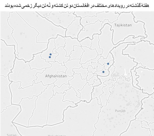 هفتۀ گذشته در رویدادهای مختلف در افغانستان دو تن کشته و نُه تن دیگر زخمی شدهاند.