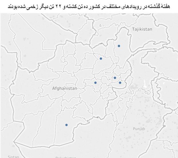 هفتۀ گذشته در رویدادهای مختلف در کشور ده تن کشته و ۲۲ تن دیگر زخمی شده بودند.