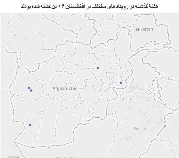 هفتۀ گذشته در رویدادهای مختلف در سراسر کشور ۱۶ تن کشته شده بودند و یک تن دیگر زخمی شده بود.