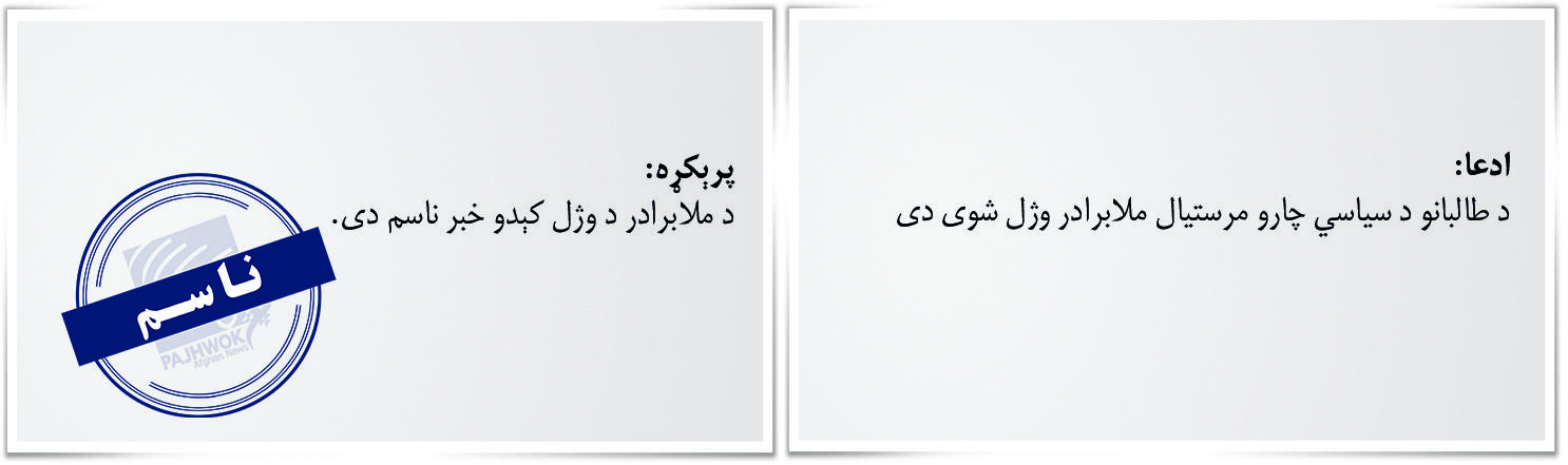 پایله: د شاهین ۲۰۹ قول اردو په نوم یوې جعلي پاڼې ادعا کړې چې د طالبانو د سیاسي دفتر مشر ملا عبدالغني برادر کراچۍ کې وژل شوی دی، خو ملي دفاع وزارت دغه پاڼه جعلي بولي او طالبان هم وایي چې ملابرادر ژوندی دی او قطر کې دی.