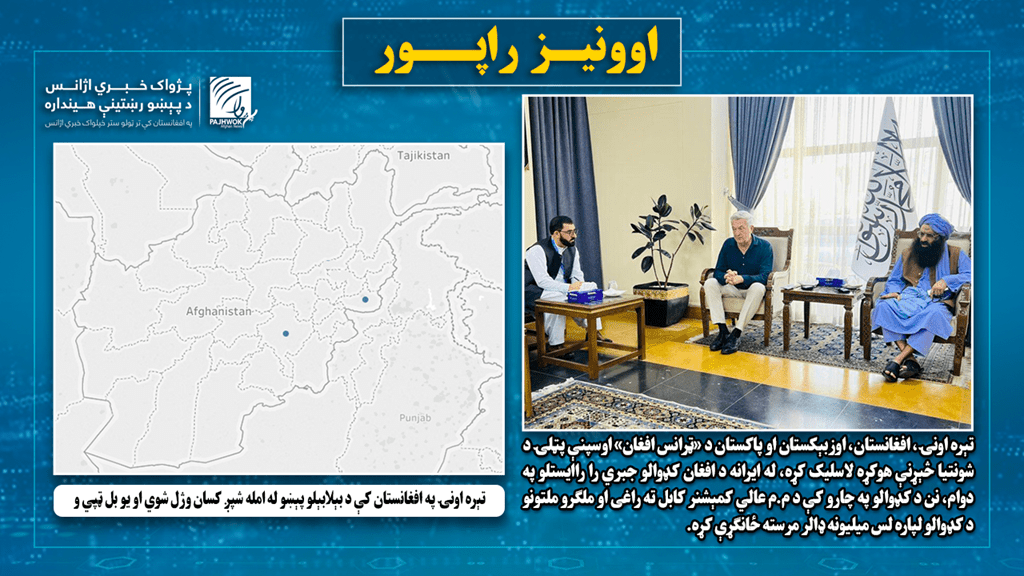 کابل (پژواک، ۲۸ چنګاښ ۱۴۰۴): تېره اونۍ، افغانستان، اوزبېکستان او پاکستان د «ټرانس – افغان» اوسپنې پټلۍ د شونتیا څېړنې هوکړه لاسلیک کړه، له ایرانه د افغان کډوالو جبري را ایستلو په دوام، نن د کډوالو په چارو کې د م.م عالي کمېشنر کابل ته راغی او ملګرو ملتونو د کډوالو لپاره لس میلیونه ډالر مرسته ځانګړې کړه.